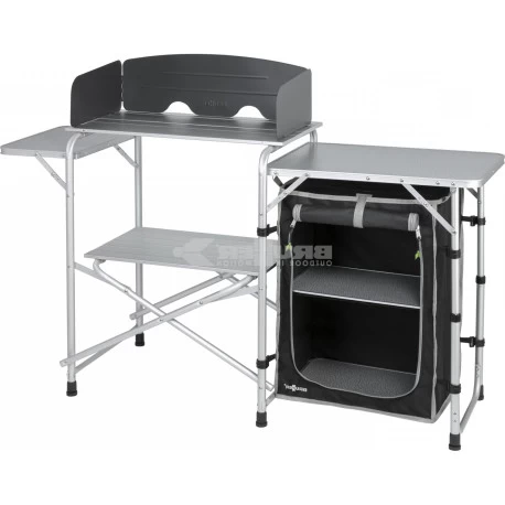 Il mobiletto Snack Easy Black offre un comodo ripiano in alluminio per il fornello, due ripiani laterali per accessori ed utensili da cucina, un appoggio in alluminio sotto al ripiano principale ed un pensile in poliestere con 2 capienti scomparti. Il paravento è compreso, così come una comoda sacca per il trasporto.