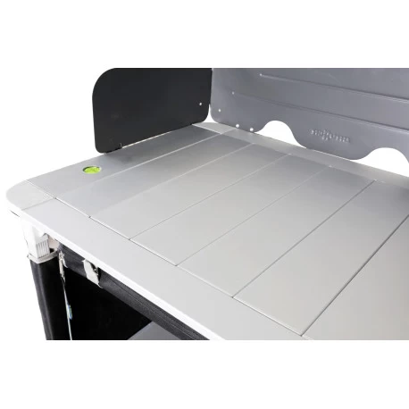 Mobiletto cucina di nuova concezione con 2 scomparti multifunzionali separati. Piano di lavoro in alluminio.