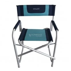 Sedia regista con struttura in alluminio. Seduta, schienale e braccioli in poliestere antisdrucciolo imbottito.